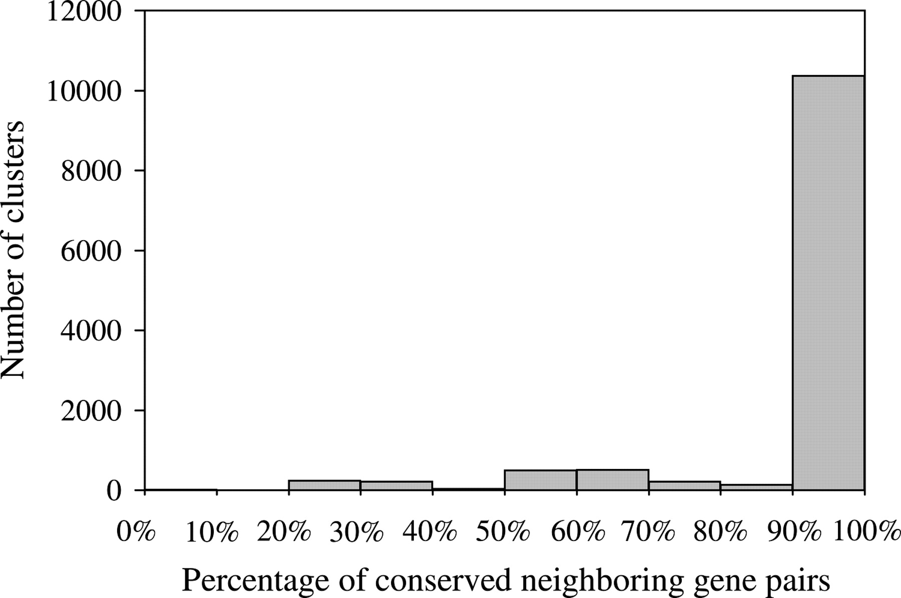 Distribution of the percentage of conserved neighboring gene pairs over all clusters.