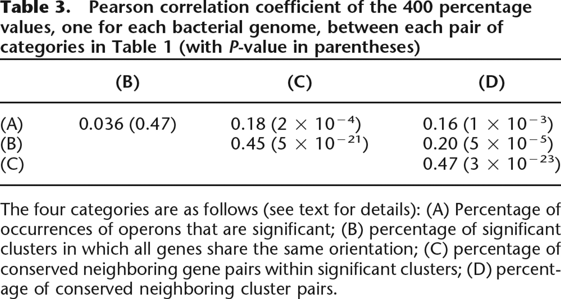 Pearson correlation coefficient of the 400 percentage values, one for each bacterial genome, between each pair of categories in Table 1 (with P-value in parentheses)