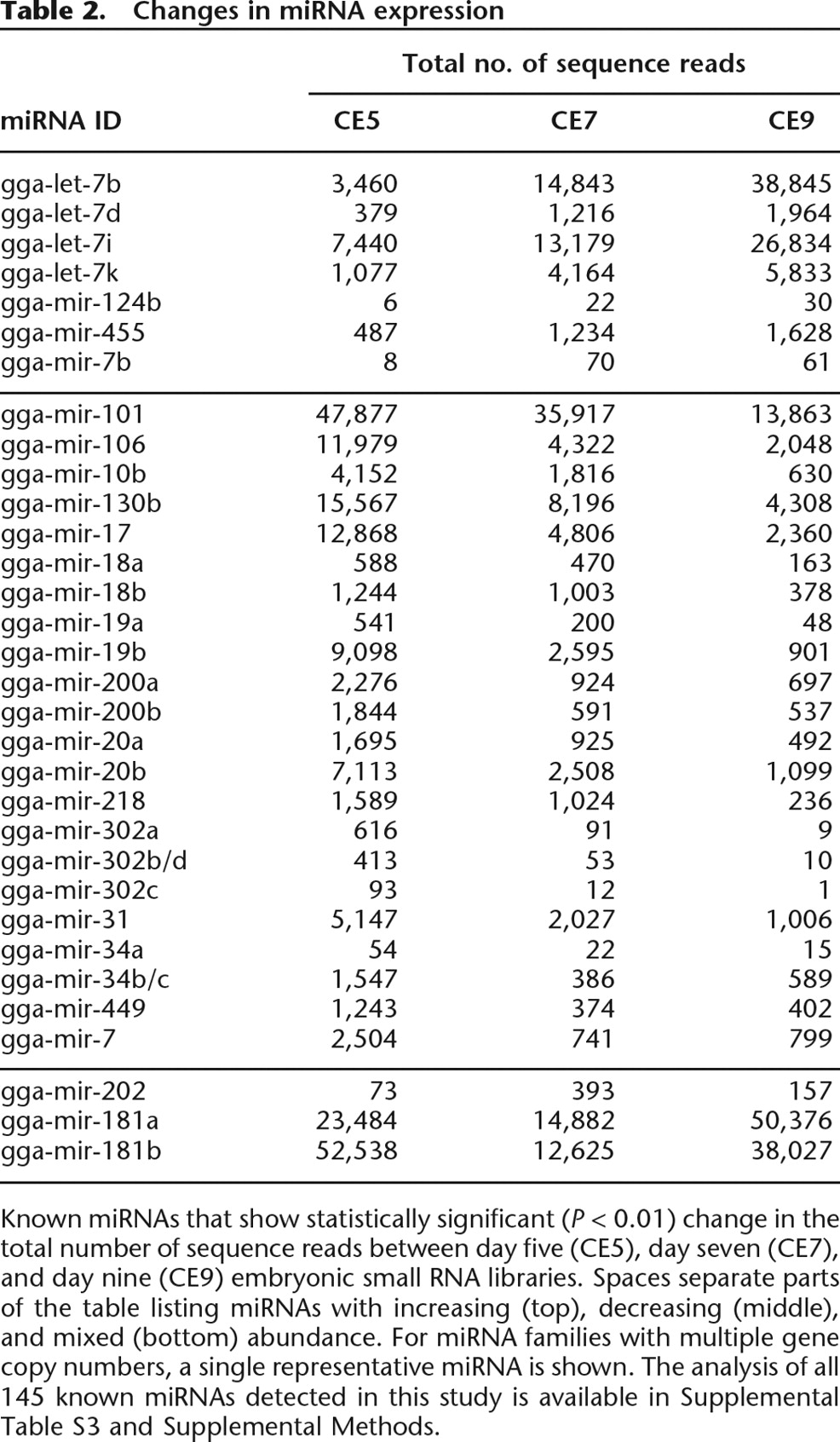 Known miRNAs that show statistically significant (P < 0.01) change in the total number of sequence reads between day five (CE5), day seven (CE7), and day nine (CE9) embryonic small RNA libraries. Spaces separate parts of the table listing miRNAs with increasing (top), decreasing (middle), and mixed (bottom) abundance. For miRNA families with multiple gene copy numbers, a single representative miRNA is shown. The analysis of all 145 known miRNAs detected in this study is available in Supplemental Table S3 and Supplemental Methods.