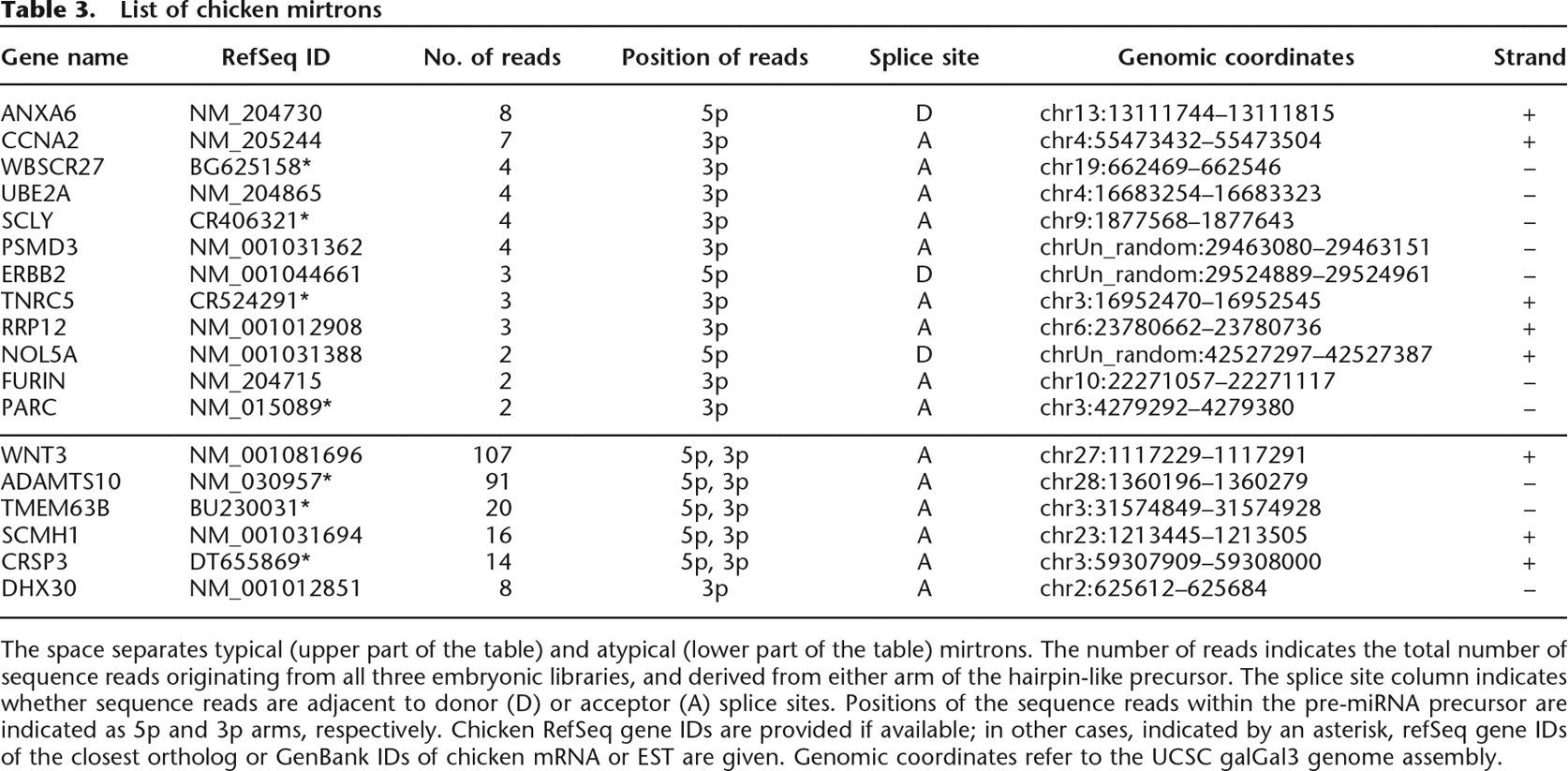 The space separates typical (upper part of the table) and atypical (lower part of the table) mirtrons. The number of reads indicates the total number of sequence reads originating from all three embryonic libraries, and derived from either arm of the hairpin-like precursor. The splice site column indicates whether sequence reads are adjacent to donor (D) or acceptor (A) splice sites. Positions of the sequence reads within the pre-miRNA precursor are indicated as 5p and 3p arms, respectively. Chicken RefSeq gene IDs are provided if available; in other cases, indicated by an asterisk, refSeq gene IDs of the closest ortholog or GenBank IDs of chicken mRNA or EST are given. Genomic coordinates refer to the UCSC galGal3 genome assembly.