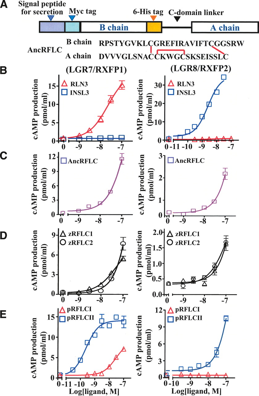RLN3 and INSL3 evolved from a bifunctional ligand. (A) Schematic presentation of the expression constructs encoding Myc- and 6-histidine-tagged relaxin family peptides linked with a mini-C domain. Mature B and A chain sequences of AncRFLC are shown (bottom). Two inter-chain and one intra-chain disulfide bridges are indicated by red lines. (B–E) LGR7 (RXFP1)- and LGR8 (RXFP2)-activation activities of human RLN3 and INSL3 (B), a resurrected ancestral RFLC peptide (AncRFLC) (C), two zebrafish RFLC peptides (zRFLC1 and zRFLC2) (D), and two platypus RFLC paralogs (pRFLCI and pRFLCII) (E). Mean ± SEM, N = 4.