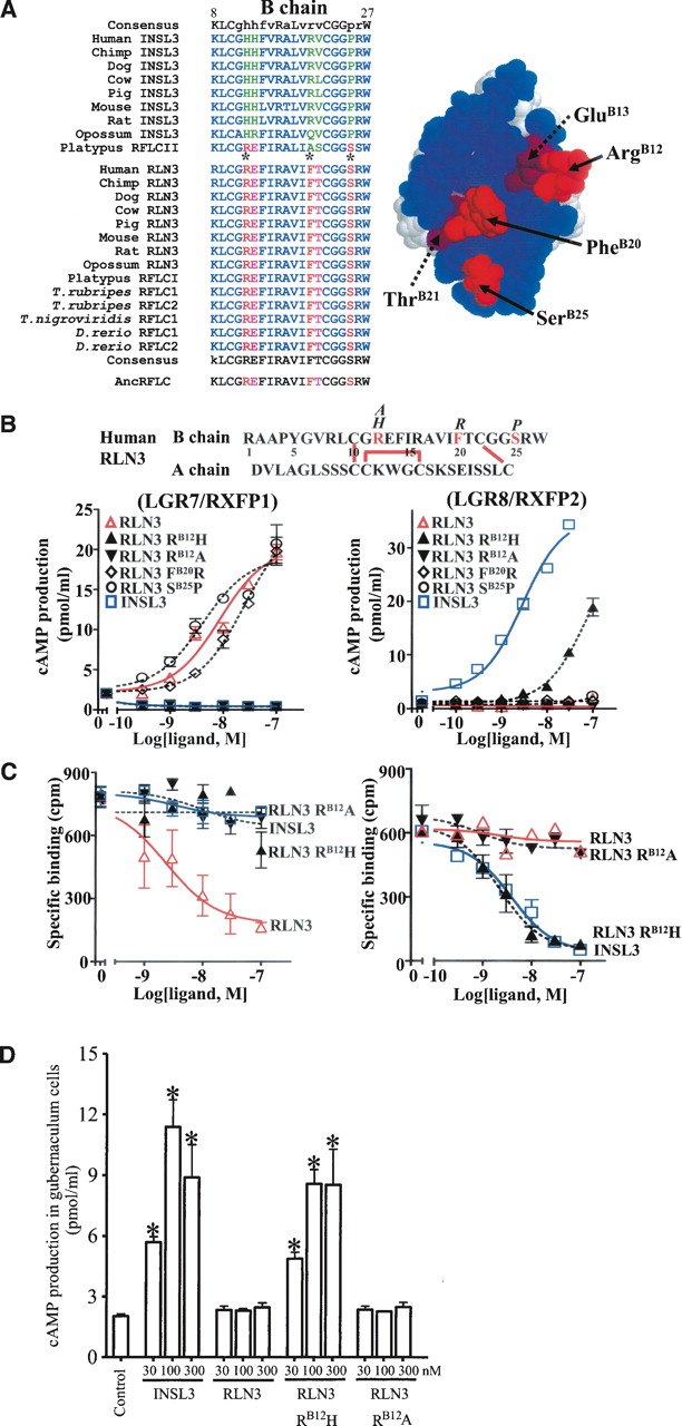 RB12H substitution in the B chain of RLN3 converts LGR7-specific RLN3 into an LGR8-specific ligand. (A) Identification of radical substitutions in the INSL3 B chain. Five radical substitutions in INSL3 (green letters). Three surface residues chosen for site-directed mutagenesis analyses (asterisks). Spatial positions of these critical residues are shown (right). In the structure model, residues in the B and A chains are indicated by blue and white space balls, respectively. (B) LGR7(RXFP1)- and LGR8 (RXFP2)-activation activity of human RLN3, INSL3, RLN3 RB12H, RLN3 RB12A, RLN3 FB20R, and RLN3 SB25P peptides (mean ± SEM, N = 4). (C) Competitive LGR7- and LGR8-binding analysis of RLN3, INSL3, RLN3 RB12H, and RLN3 RB12A peptides (mean ± SEM, N = 3). (D) Stimulation of cAMP production in cultured rat gubernaculum cells by INSL3 and RLN3 RB12H peptides (mean ± SEM, N = 4). (*) Significantly different from controls (P < 0.01).