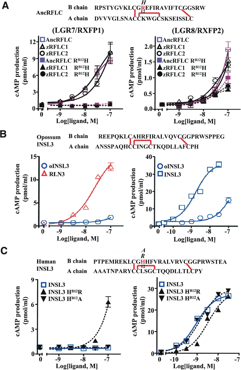 Ablation of LGR7-activation activity of AncRFLC and restoration of lost LGR7-activation activity in human INSL3 by point mutation. (A–C) LGR7 (RXFP1)- and LGR8 (RXFP2)-activation activity of AncRFLC RB12H, zRFLC1 RB12H, and zRFLC2 RB12H peptides (A), opossum INSL3 peptide (oINSL3) (B), and INSL3 HB12R and INSL3 HB12A peptides (C). Mean ± SEM, N = 4.