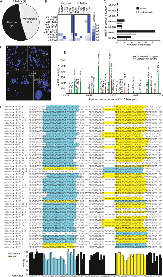 Novel microRNAs in monotremes. (A) Pie graph of monotreme species distribution of 180 novel miRNAs. Eighty-one miRNAs were sequenced in both platypus and echidna small (gray); 95 were only in platypus (black); and four were cloned only in echidna (white), although their sequences were present in the platypus genome. (B) Novel miRNA tissue expression profiles. The expression score represented by blue squares is a ratio of the number of normalized reads in that tissue versus all tissues in that organism. Expression data for 10 of the most highly expressed novel miRNAs is shown. (C) Testis miRNA classification. Ninety-two novel miRNAs were highly expressed in testis and were derived from one of seven related hairpin precursors. The number of miRNAs and miRNA seed sequences derived from each precursor category is shown. (D) Five out of nine contigs containing testis-expressed novel miRNAs map to X1q. Fluorescence in situ hybridization with BAC and Fosmid clones containing miRNA clusters on male platypus metaphase chromosomes. (i) BAC 175h10 from contig 8388 (green) and BAC 273L19 from contig 7359 (red) on the long arm of X1. (ii) Colocalization of BAC 175h10 from contig 8388 (green) and BAC 272K3 from contig 22,847 (red) on X1q. (iii) Localization of Fosmid 0879F15 from contig 7160 (green) on X1q. (Insert) Localization of Fosmid 1002L21 (contig 11,344) on X1q. (iv) BAC clones 686C10 (green) and 802P20 (red) from contig 1754 map to a metacentric autosome. (E) Novel testis-expressed chromosome X1 miRNA cluster. Only small RNAs that map to the genome three times or less are shown. The cloning frequency divided by the number of genome matches for each miRNA is represented by a bar. Platypus miRNAs are plotted in green, echidna in red; platypus and echidna bars are independent and not additive. Gaps in the genome assembly are shown by //. A LINE element insertion that disrupted an echidna small RNA precursor is represented in yellow. (F) Orientation and sequence conservation of 53 miRNAs derived from the miR-1421 group of precursors. Multiple sequence alignment of 53 miR-1421 precursors with the sequence of the mature miRNA highlighted in blue and the miRNA star in yellow. The percent of nucleotides in the alignment that match the consensus for each position is graphed below. Perfectly conserved nucleotides are marked with an asterisk (*).