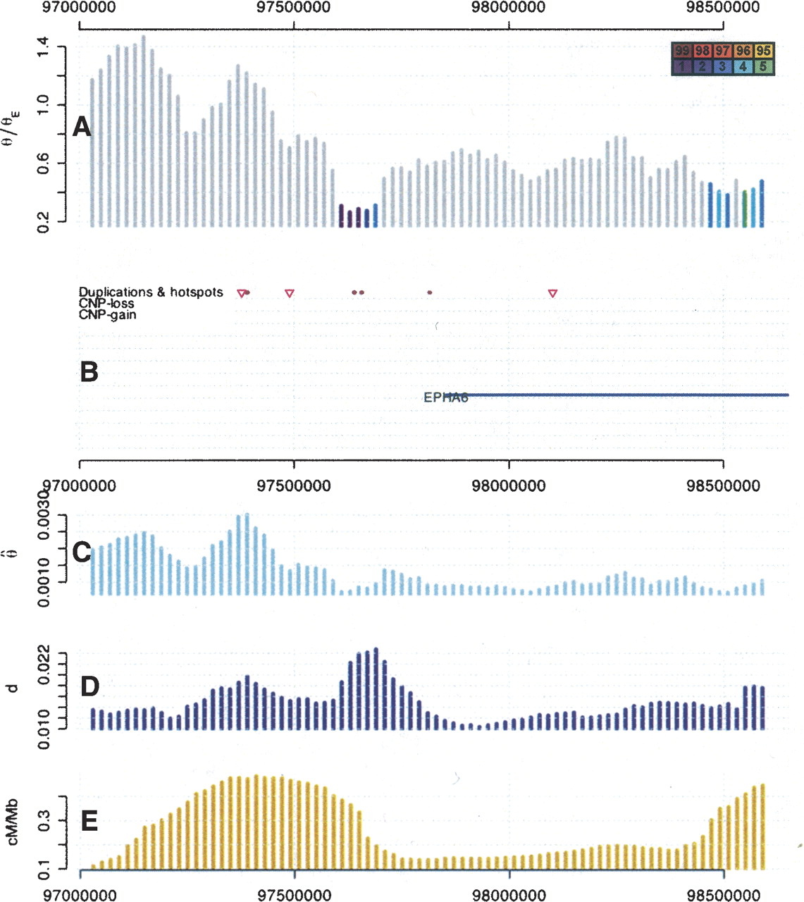 /θE lie outside of a 95%, 96%, etc., confidence interval obtained through simulations. (B) Pink triangles mark recombination hotspots; blue lines correspond to genes from the RefSeq gene track of the UCSC genome