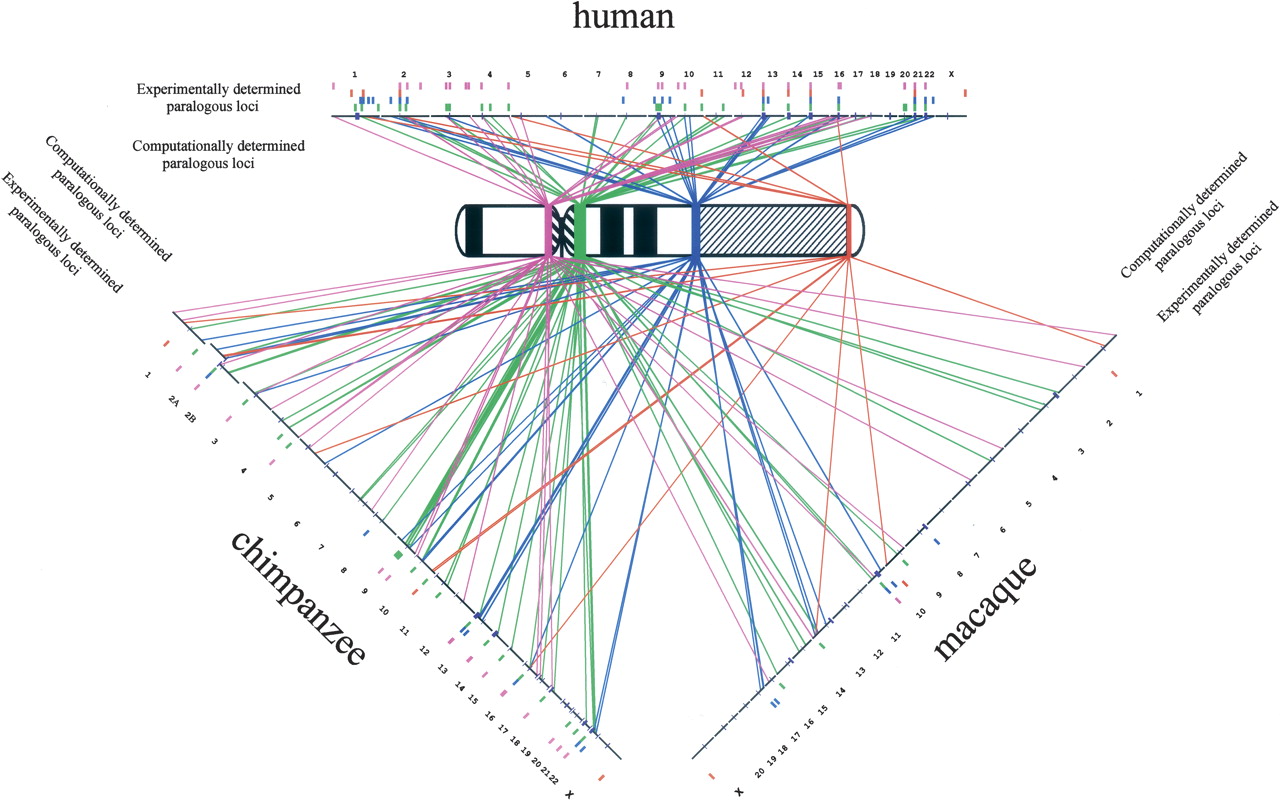 Comparative paralogous duplication pattern of human Y-chromosomal segmental duplications. An ideogram of the G-banded pattern of the normal human Y is shown in the middle. The colored boxes on the chromosome represent the euchromatin/heterochromatin transition regions composed of segmental duplications. The autosomes and the X chromosome are illustrated as small horizontal black lines above (human), rightward diagonally disposed (chimpanzee), and leftward diagonally disposed (macaque). Each chromosome is tagged by the corresponding chromosome number. Heterochromatic regions (constitutive heterochromatin, telomeric caps, and NORs) are indicated as tiny purple boxes on the horizontal lines. All diagonal lines represent pairwise alignments of ≥1 kb and ≥90% nucleotide identity identified by whole-genome sequence comparisons. The small colored boxes in-between the chromosomes and their corresponding numbers display the multi-site pattern from comparative FISH. Concerning the Yq11.1/Yq11.21, Yq11.23/Yq12, and Yq12/PAR2 region, experimental and computational results are 48% consistent for the human, 45% for the chimpanzee, and 30% for the macaque. For the Yp11.1/Yp11.2 region, the concordance decreases to 21% (human), 23% (chimpanzee), and 11% (macaque). Please note that paralogies detected by whole-genome sequence comparisons do not correspond to ancestral duplicon locations.
