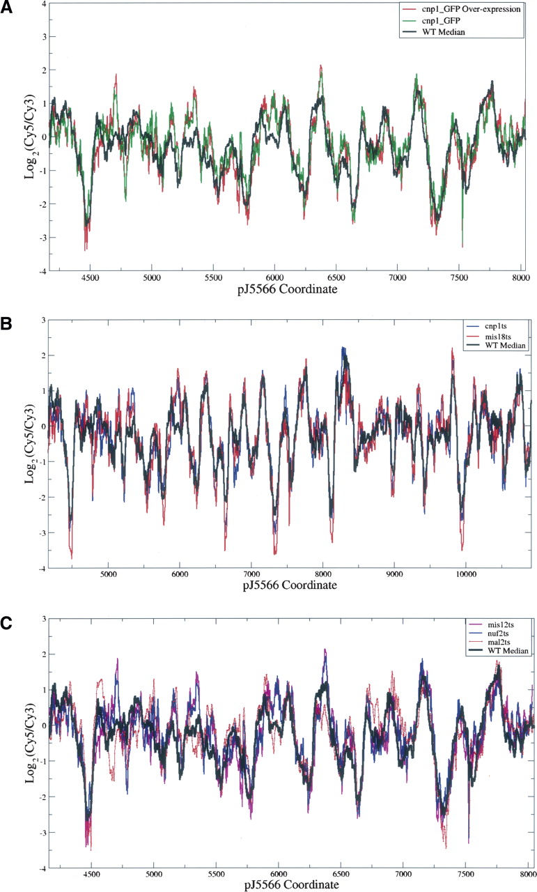Chromatin structure is preserved in mutants. (A) Wild-type versus Cnp1p overexpression. (B) Wild type versus mutants affecting Cnp1p localization. (C) Wild type versus outer kinetochore mutants. The array design in B covered a region longer than that in A and C.