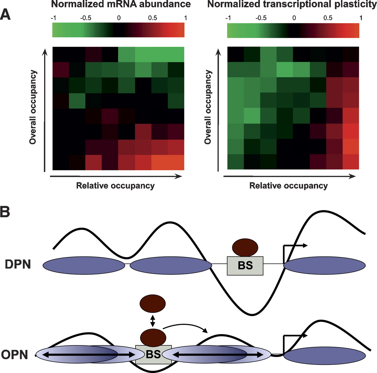 A model for nucleosome organization at low-plasticity and high-plasticity promoters. (A) Average mRNA levels are correlated with overall nucleosome occupancy, whereas transcriptional plasticity is correlated with the relative pattern of nucleosome occupancy. Genes were sorted by overall nucleosome occupancy (Y-axis) or relative pattern of nucleosome occupancy (proximal/distal; X-axis), and divided to eight bins of equal sizes. The average normalized mRNA abundance (left) or transcriptional plasticity (right) is shown for each of the 64 bins. (B) The architecture of two promoter classes. Low-plasticity (DPN) promoters tend to have well-positioned nucleosomes and a strong NFR directly upstream of the TSS. High-plasticity (OPN) genes have “fuzzy” nucleosomes whose positions are heterogenic and dynamic, perhaps as a consequence of competition with transcription factors. Binding sites are distal to the TSS, and binding of regulators to these sites may influence nucleosome positions proximal to the TSS, thus affecting transcription. (Brown circles) Transcription factors in a binding equilibrium to their binding sites (BS), (ovals) nucleosomes, (curves) pattern of nucleosome occupancy.
