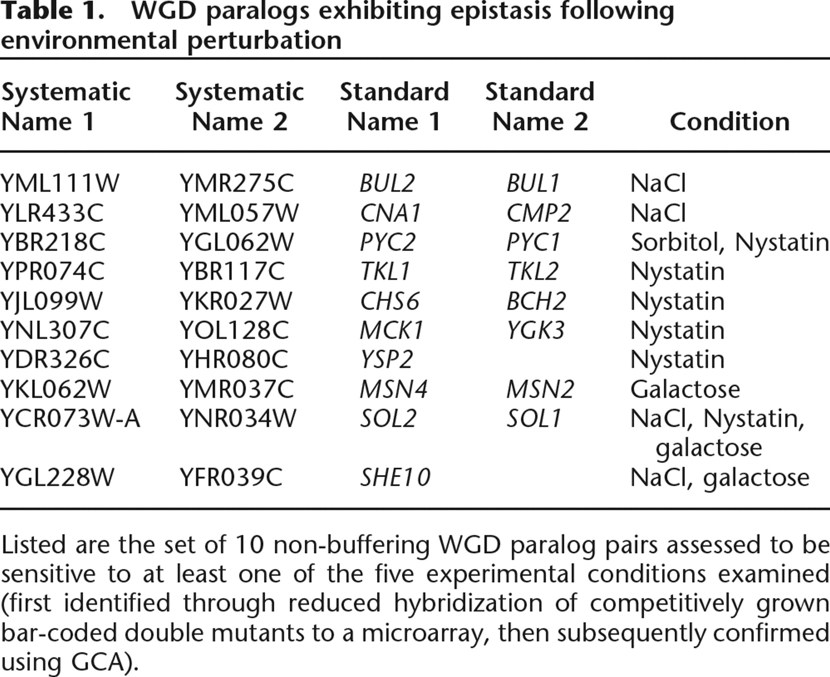 Listed are the set of 10 non-buffering WGD paralog pairs assessed to be sensitive to at least one of the five experimental conditions examined (first identified through reduced hybridization of competitively grown bar-coded double mutants to a microarray, then subsequently confirmed using GCA).