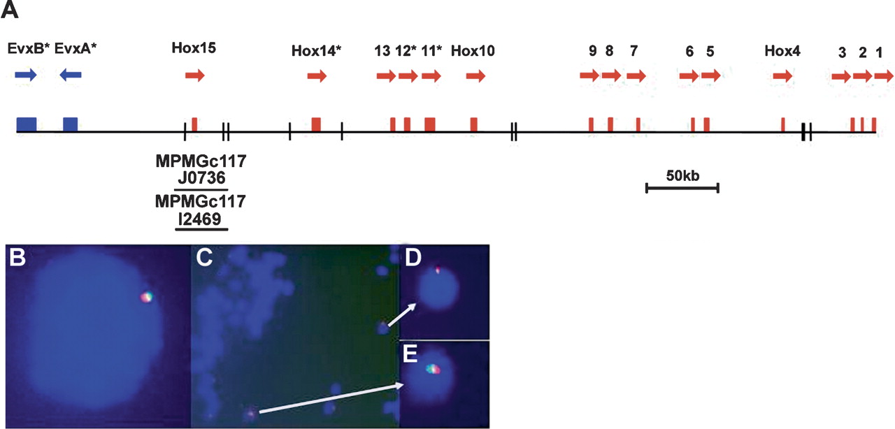 The amphioxus genome contains 15 Hox genes. (A) Genomic organization of the 470-kb amphioxus Hox gene cluster and linked Evx gene pair; beneath the horizontal line are shown the two Hox15 cosmid clones analyzed. Black vertical lines represent small sequence gaps; asterisks indicate genes with an intron within the homeobox; arrows denote transcriptional orientation. FISH to amphioxus interphase nucleus (B) and metaphase chromosomes (C–E). (Red signal) Cosmid MPMGc117I2469 (AmphiHox15); (green signal) cosmid MPMGc117L0856 (AmphiHox12 and AmphiHox13). Methods as described in Castro and Holland (2002).