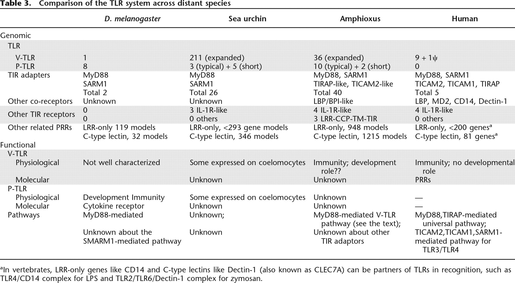 aIn vertebrates, LRR-only genes like CD14 and C-type lectins like Dectin-1 (also known as CLEC7A) can be partners of TLRs in recognition, such as TLR4/CD14 complex for LPS and TLR2/TLR6/Dectin-1 complex for zymosan.