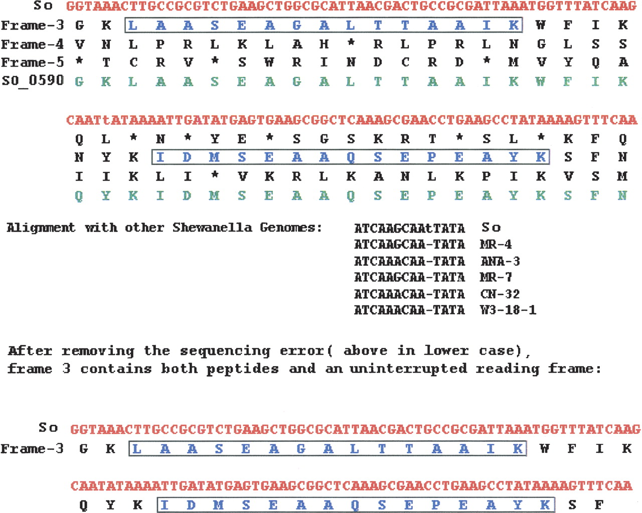Frameshift generated by sequencing error. In top panel, the nucleotide sequence for gene SO0590 is shown in red, the amino acid sequence of the protein is shown in green, and the amino acid sequences of the three translated frames are shown in black. Peptides identified by mass spectrometry are marked in blue (surrounded by boxes). The middle panel shows the ClustalW alignment with other Shewanella species in the region where frameshift occurs. The erroneous insertion of an extra “t” stands out in the alignment. The bottom panel indicates that both peptides fall in the original frame if the extra nucleotide is removed.