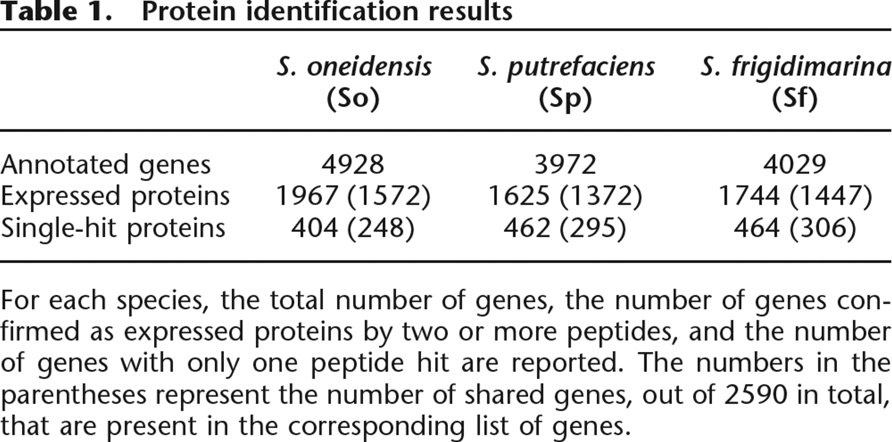 For each species, the total number of genes, the number of genes confirmed as expressed proteins by two or more peptides, and the number of genes with only one peptide hit are reported. The numbers in the parentheses represent the number of shared genes, out of 2590 in total, that are present in the corresponding list of genes.