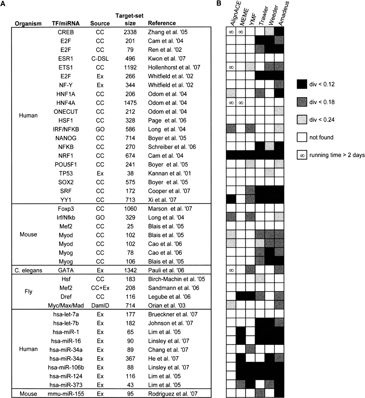 The metazoan target-set compendium and benchmark results on it. (A) The compendium of metazoan TF/miRNA target sets collected from the literature. The “Source” column indicates the experimental procedure or database from which the target set was derived: gene expression microarrays (Ex), ChIP-chip (CC), ChIP-DSL (C-DSL), DamID (van Steensel et al. 2001), or Gene Ontology (GO) database (Ashburner et al. 2000). For additional information and references, see http://acgt.cs.tau.ac.il/amadeus. (B) Performance of motif finding tools on each target set—each successful motif recovery is marked by a gray-shaded box, according to the PWM divergence (darker shades of gray indicate higher similarity of the recovered motif to the one in the literature); the ∞ symbol marks long executions (>48 h) that were aborted. Here, Amadeus was run with the HG enrichment score. The success-rate patterns of the six motif finders are almost identical when comparing different target sets of the same TF. For example, in all three E2F data sets, Amadeus, Weeder, and Trawler are the only tools that recovered the correct motif; in the two Myod sets, Amadeus and Weeder succeeded with PWM divergence cutoff 0.18, AlignACE succeeded with cutoff 0.24, and MEME and YMF failed with all cutoffs. This consistency, observed for all six TFs that are represented by more than one set in our compendium, is not a result of large overlaps between the target sets, as such overlaps were avoided in the construction of the compendium. Instead, it is likely to stem from properties inherent to the TFs, such as the extent and type of their BSs degeneracy.