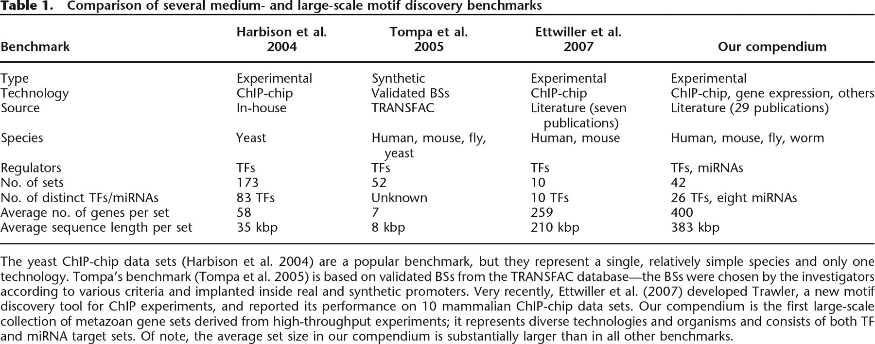 The yeast ChIP-chip data sets (Harbison et al. 2004) are a popular benchmark, but they represent a single, relatively simple species and only one technology. Tompa’s benchmark (Tompa et al. 2005) is based on validated BSs from the TRANSFAC database—the BSs were chosen by the investigators according to various criteria and implanted inside real and synthetic promoters. Very recently, Ettwiller et al. (2007) developed Trawler, a new motif discovery tool for ChIP experiments, and reported its performance on 10 mammalian ChIP-chip data sets. Our compendium is the first large-scale collection of metazoan gene sets derived from high-throughput experiments; it represents diverse technologies and organisms and consists of both TF and miRNA target sets. Of note, the average set size in our compendium is substantially larger than in all other benchmarks.