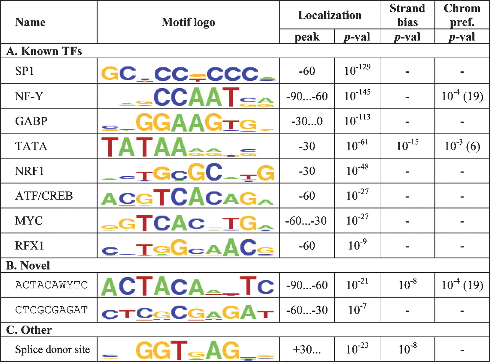 Amadeus was run on all human and mouse promoters and searched de novo for motifs that are significantly localized (i.e., overrepresented at a particular distance from the TSS, measured in bins of size 30) in both species. Approximately 23,000 and 24,000 human and mouse promoters, respectively, were analyzed. Promoters spanned from 500 bp upstream to 100 bp downstream of the TSS. Both known and novel motifs were found. All P-values listed in the table are for human. “Peak” refers to the center(s) of the location bin(s) with the largest motif occurrence rate. Amadeus also tests whether the motif occurrences are distributed nonuniformly between the strands (“Strand bias” column, showing the significance in human) or across the chromosomes (“Chrom pref.” column, showing also the overrepresented chromosome in human in parentheses).