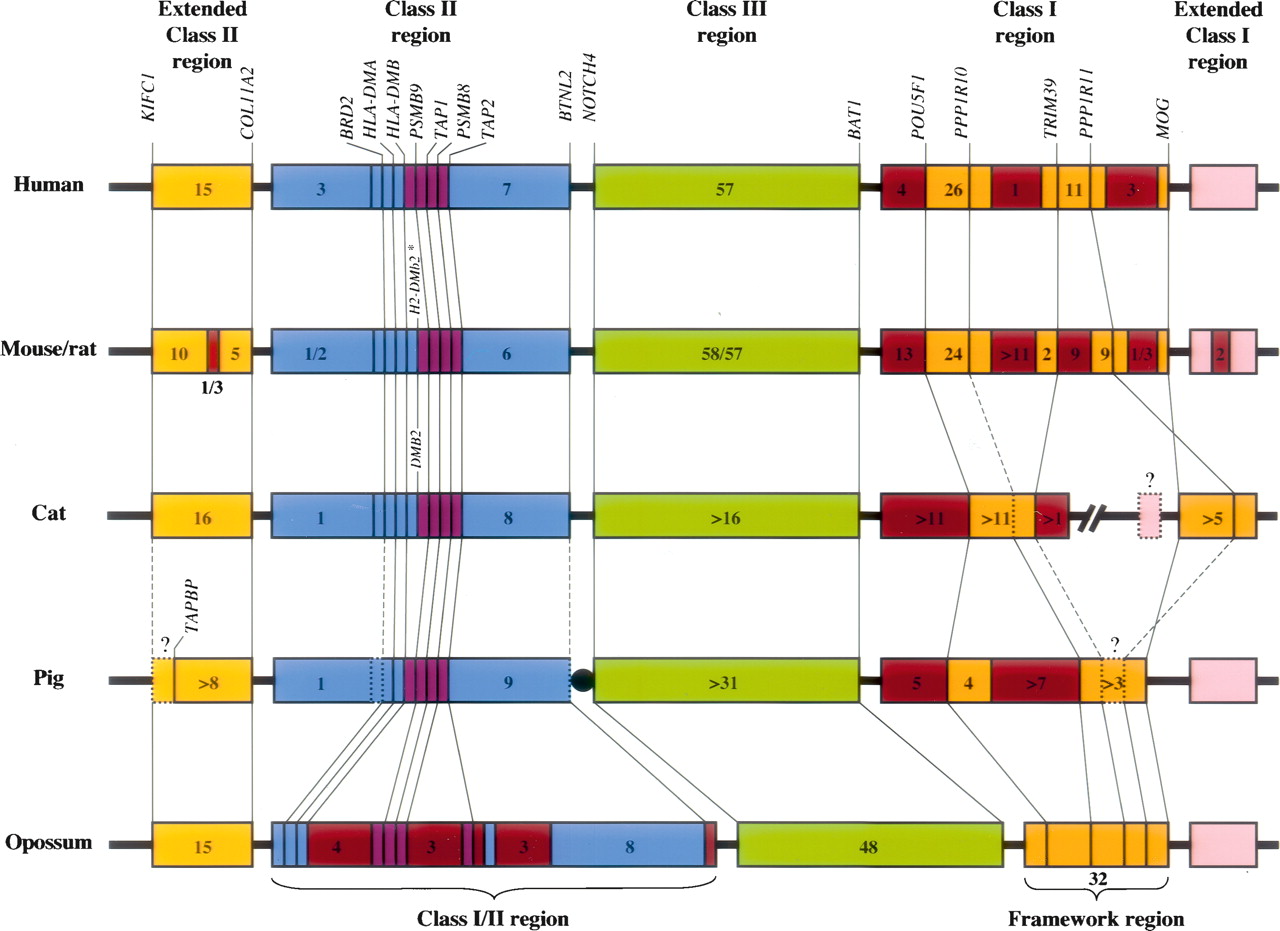 Comparison of MHC organization in representative mammals (figure and legend adapted from Belov et al. 2006, with permission). Of particular note in the opossum MHC is the arrangement of the Class I and II genes into a single interspersed cluster and the absence of Class I genes from the Framework region. These characteristics are reminiscent of arrangements seen in the MHCs of nonmammalian vertebrates. Lines between MHCs of different species indicate the positions of orthologous genes. The asterisk indicates the presence of a duplicated DMB locus (H2-DMb2) in mouse, but not in rat. Dashed lines and question marks represent missing or uncertain data for the particular gene or portion of the genome. Numbers within boxes indicate the number of predicted genes identified within that segment (pseudogenes not included). Unless otherwise indicated, the small boxes indicate individual genes. Map not drawn to scale. Additional details regarding this diagram and implications for the evolution of the mammalian MHC may be found in Belov et al. (2006).