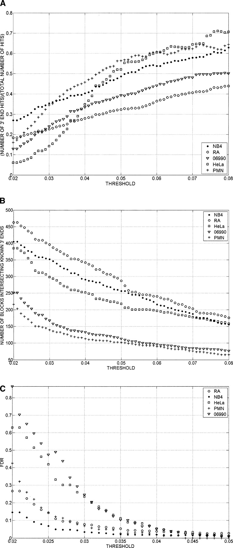 (A) Ratio of 3′ end signals for annotated genes to total 3′ end signals as a function of the threshold value used to call 3′ ends. After quantile normalization, data from replicates were combined by averaging the signals of the replicates. Signal intensity yi = log(Ri) − log(Gi) was assigned to each probe, where log(Ri) and log(Gi) are Cy5 and Cy3 channels’ intensities after the aforementioned transformations were performed. Contiguous segments (bars) due to the signal coming from the enriched regions were obtained by joining probes with intensities yi above the threshold separated by less than a certain distance (max-gap of 114 bp). Only segments whose length was greater than a particular size (min-run of 114 bp) were selected. As the threshold for calling a positive signal was lowered, a greater fraction of the calls were from regions not adjacent to the 3′ ends of known genes. Results are shown for five cell types. GENCODE annotation was used for the analysis. (B) Total number of 3′ end signals associated with annotated genes as a function of threshold. Signals are considered as intersecting a known 3′ end if they lie within 2500 bases downstream from the known end. Signals were calculated as in A. The number of signals associated with known genes increased throughout the range as thresholds were lowered. Results are shown for five cell types. 06990 and PMN are end stage differentiated cells (a lymphoblastoid cell and a normal neutrophil); therefore, it is not surprising to see that a smaller number of 3′ ends are present in these cell lines. GENCODE annotation was used for the analysis. (C) False-discovery rate (FDR) as a function of the threshold used to call 3′ ends. Results are shown for five cell types. For each data set the genomic locations of the probes on the microarray were randomly shuffled. The max-gap and min-run procedures described in “Bioinformatic Analysis” section were applied to the randomized data. The FDR was computed as FDR(threshold) = N1(threshold)/N2(threshold), where N1 is the number of discovered blocks for the randomized data and N2 is the number of blocks for the nonrandomized data. FDR increases as the threshold for calling a positive signal decreases.