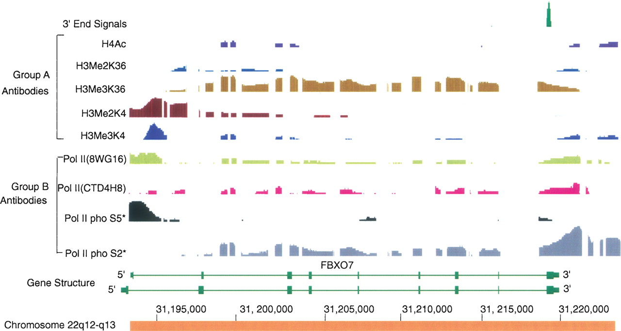Example of the most common pattern for histone and polymerase modifications at the 3′ ends of expressed genes. Chromatin IP results from the chromosome 22q12-q13 region are displayed with the Integrated Genome Browser (IGB) on Human Assembly 7. FBXO7 gene is annotated at this locus. Two antibody groups were used: Group A, human histone modifications; Group B, various phosphorylation states of human PolII. All the chromatin immunoprecipitates were prepared from HeLa cells unless starred to indicate the results were from K562 cells. The information about antibodies used for the data in Figs. 5, 6, 7, 8 is listed in Table 3.The first row shows the RNA polyadenylation signal, which was detected by the 3′ end enrichment method. This 3′ end signal corresponds exactly to the reported 3′ end of the mRNA (RefSeq). Dimethylation of histone 3 lysine 4 extends over a broader region than trimethylation of lysine 4. PolII serine 5 phosphorylation always shows a peak at the 5′ end of the gene. As expected, serine 2 phosphorylation extends through the body of the gene and beyond the poly(A) site. The signal increases just before disappearance of the polymerase from DNA, indicating RNA polymerase pausing occurs before release. Histone 3 K36 trimethylation tracks with PolII serine 2 through the body of the gene; however, just beyond the poly(A) site, trimethylation begins to decrease and apparently becomes uncoupled from serine 2 phosphorylation.