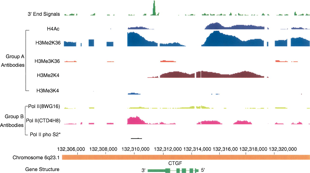 Example of another type of deviation from the standard pattern. In this figure, the dimethylation of both histone 3 lysine 36 (K36) and lysine 4 (K4) extends across the entire gene. Interestingly, histone dimethyl lysine 36 is also enriched for some distance upstream of the 5′ end of the CTGF gene and then decreased to lower levels over most of the body of the gene. Histone dimethyl lysine 4 shows almost the inverse pattern of dimethyl lysine 36, increasing later than lysine 36, mainly retained over the body of the gene, and dropping just before the 3′ end signal appears. It seems that PolII (4H8) and acetylated histone 4 were similarly distributed to histone dimethyl lysine 36 throughout this whole region. Unlike typical genes, trimethylations at lysine 4 and lysine 36 sites were essentially absent. Note that transcription of this gene proceeds right to left.