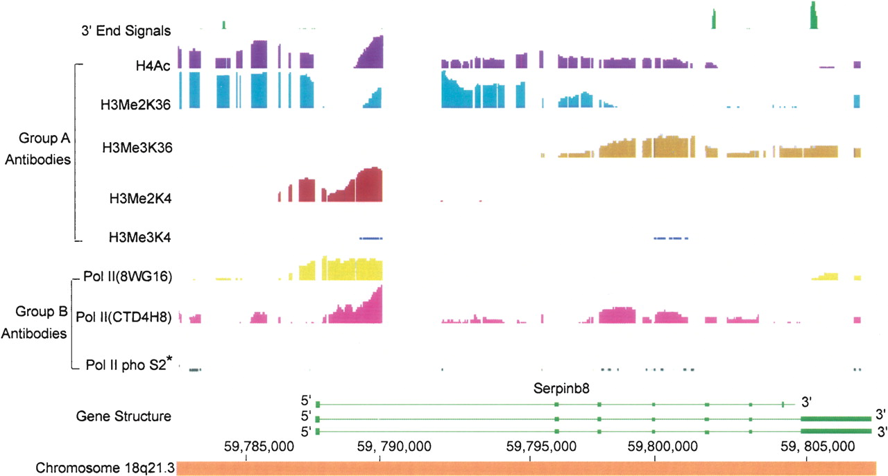 An example of another type of deviation from the standard pattern. In several large genes, such as SERPINB8, there are stretches of histone lysine 36 (K36) dimethylation extending over tens of kilobases and alternating with stretches of trimethylation. In some other genes, the pattern is revered with the 5′ end portion showing trimethylation. The functional significance of these patterns remains to be determined.