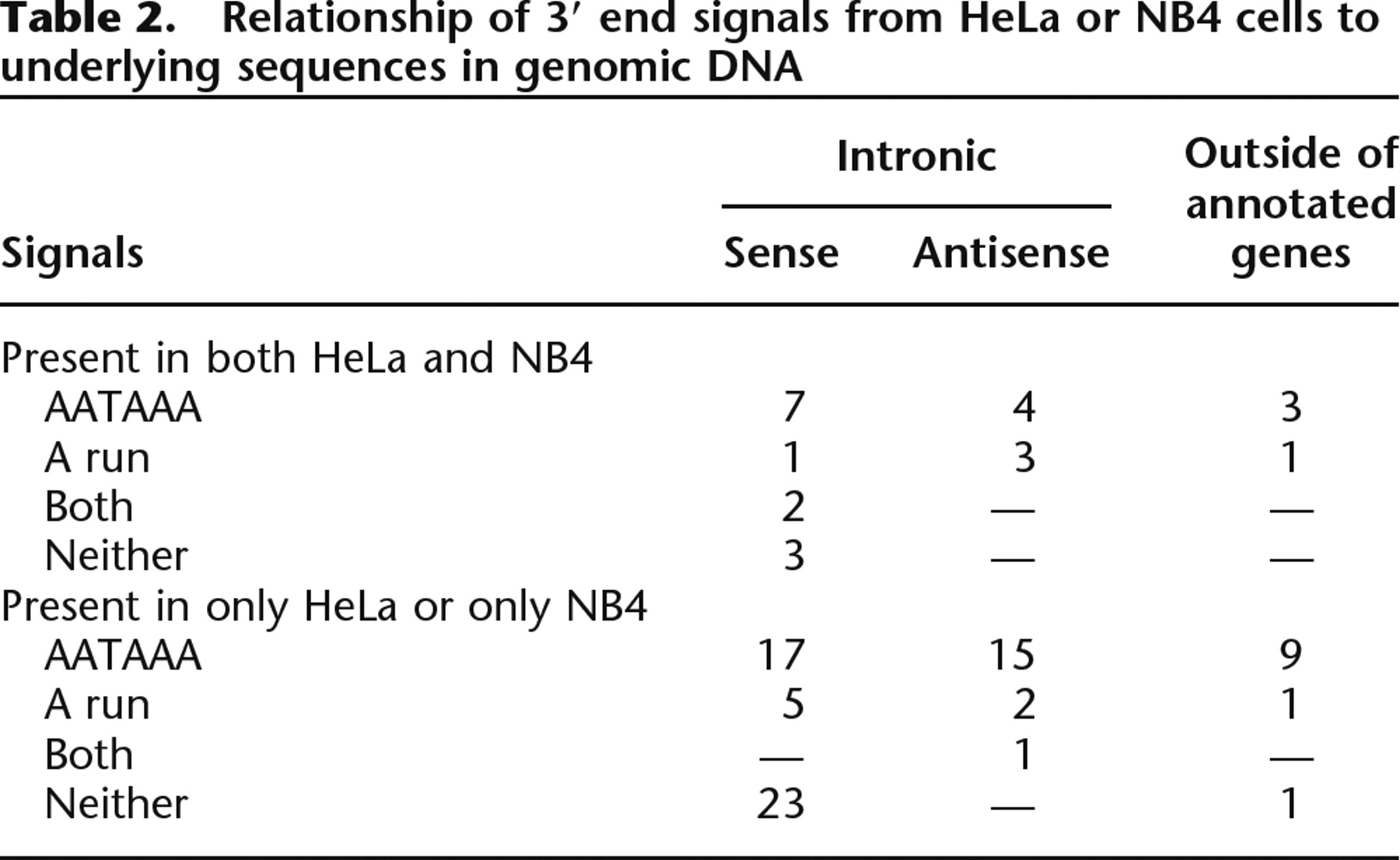 Relationship of 3′ end signals from HeLa or NB4 cells to underlying sequences in genomic DNA