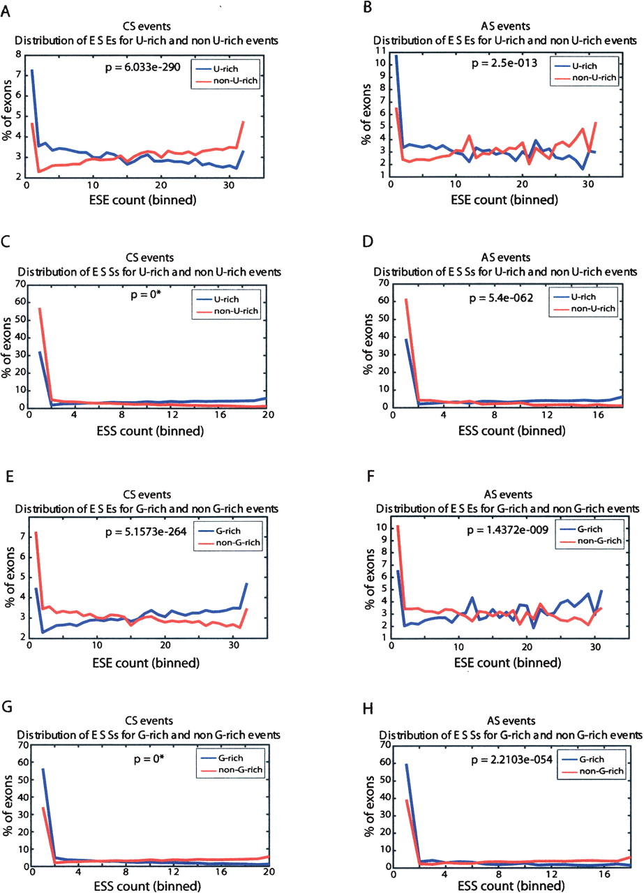 Intron sequences with elevated U-content are associated with exons having reduced frequencies of ESEs and increased frequencies of ESSs. Distribution of constitutively spliced (CS) (A) and alternatively spliced (AS) (B) exons with different frequencies of ESEs that are associated with either “U-rich” downstream intronic sequences (blue lines) or non-U-rich downstream intronic sequences (red lines). Panels C and D show the corresponding plots when comparing numbers of exons with different frequencies of ESSs. A single cut-off for U-richness of 28% (>28% U-content defined as U-rich, and <28% U-content defined as non-U-rich) was used. ESE and ESS counts (X-axis) are binned into equiprobable bins over the entire corresponding event set (CS/AS), so that higher counts bins have a higher X-value. Panels E–H repeat this analysis for ESE (E,F) and ESS (G,H) elements for G-rich and non-G-rich intronic flanks. A single threshold of 22%–25% was used to separate events that contain G-rich or non-G-rich flanking intron sequences. (*)P-value too small to compute.