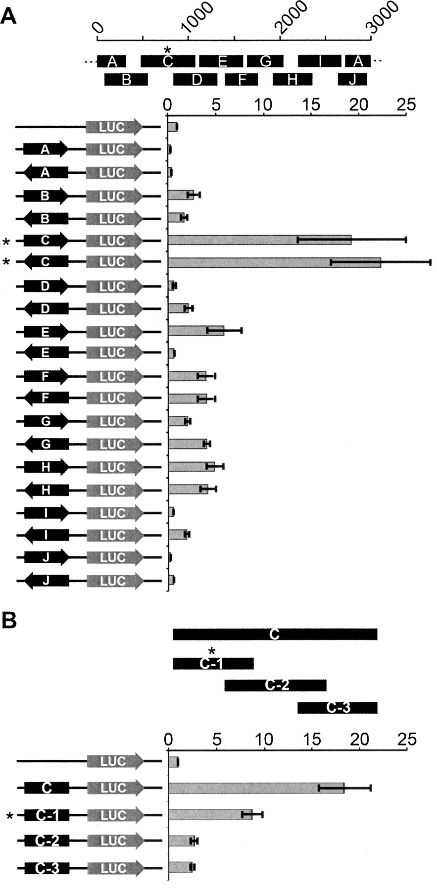 Identification of a bidirectional promoter in DXZ4. (A) A single 3-kb DXZ4 monomer is represented by 0–3000 bp scale. The approximate location of subfragments A–J are shown below the monomer. DXZ4 subfragments cloned upstream of the Luciferase reporter gene in pGL3-Basic are shown to the left. The orientation of the fragment is represented by the arrow. The level of luciferase activity detected relative to that of the empty vector (assigned a value of 1) is indicated (0–25×). (B) DXZ4 subfragment C is represented by the black solid bar, below which are shown the relative locations of the three subregions. Below are shown the five different pGL3-Basic constructs tested for luciferase activity. All data (A,B) represent the mean and standard error for four independent experiments. The asterisk highlights the subregion fragment that retained the most promoter activity.