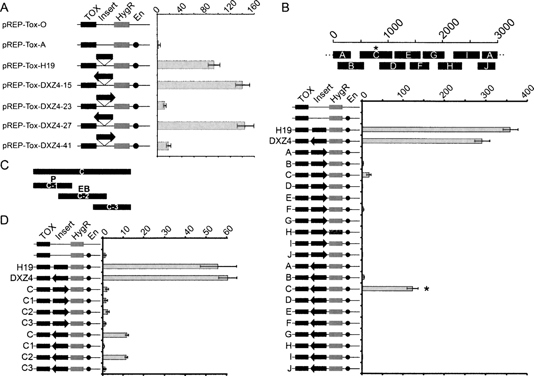 DXZ4 unidirectionally interferes with promoter–enhancer communication in vitro, an attribute confined to DNA encompassing the CTCF binding site. (A) Schematic representation of the different constructs are labeled and shown on the left. The location of the diphtheria toxin-A gene (TOX), hygromycin-B resistance gene (HygR), insert (Insert), and SV40 enhancer (En) are indicated for the rectangles and circles. Insert identity is indicated to the left of each construct. The orientation of DXZ4 inserts are represented by the black arrows. The graph to the right indicates the number of colonies obtained for each construct after 2–3 wk of selection for hygromycin-B. Data represents the mean and standard error for four independent experiments. (B) A single 3-kb DXZ4 monomer is represented by the 1–3000 bp scale. The approximate location of subfragments A–J are shown below the monomer. Data obtained as for A. The asterisk highlights the subfragment that retained most of the insulator activity. (C) Representation of the subfragments of C (C1–C3) that were cloned in either orientation into pREP-ToxA. The P indicates the fragment containing the highest promoter activity, whereas the EB indicates the fragment containing enhancer-blocking activity determined below. (D) Data obtained for the C subfragments determined as for A.