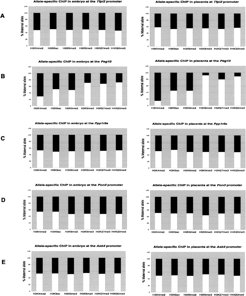 Allelic histone modifications at different promoter sites in mouse embryo and placenta. Allele-specific chromatin composition was quantitated using polymorphisms at specific promoter region, in both embryo and placenta. ChIP was performed using antibodies recognizing the specific modification H3K4me2, H3K9ac, H3K9me2, H3K9me3, H3K27me3, and H4K20me3. Polymorphisms and primer locations are given in Supplemental Table 5. The ratio of the allele-specific histone modification at a specific promoter region was expressed as a percentage of maternal (white bars) or paternal (black bars) allele in the total (maternal + paternal, or 100%) immunoprecipitation. ChIP was performed at the Tfpi2 promoter (A), Peg10 DMR (B), Ppp1r9a promoter (C), Pon3 promoter (D), and the Asb4 promoter (E).