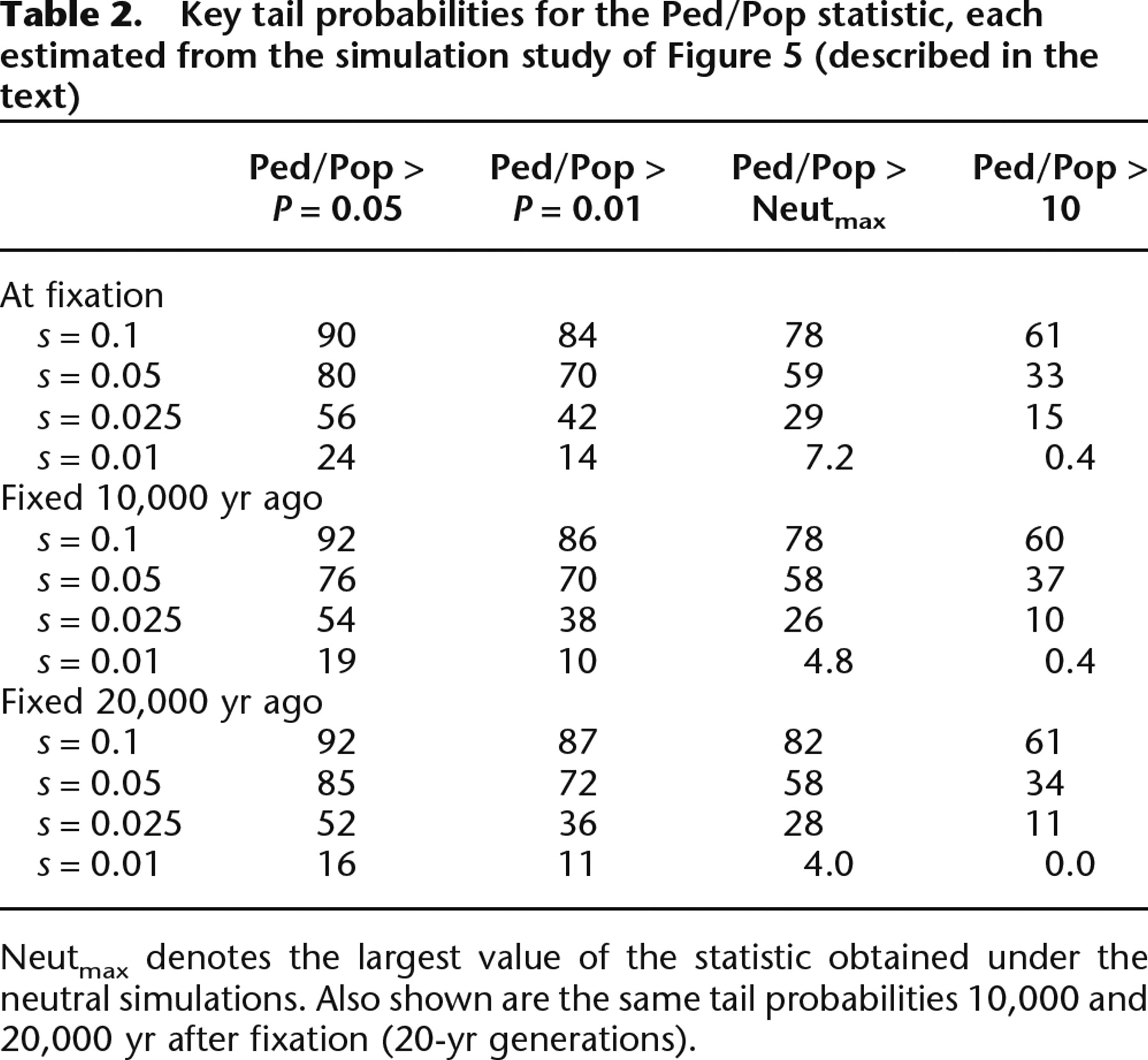 Neutmax denotes the largest value of the statistic obtained under the neutral simulations. Also shown are the same tail probabilities 10,000 and 20,000 yr after fixation (20-yr generations).