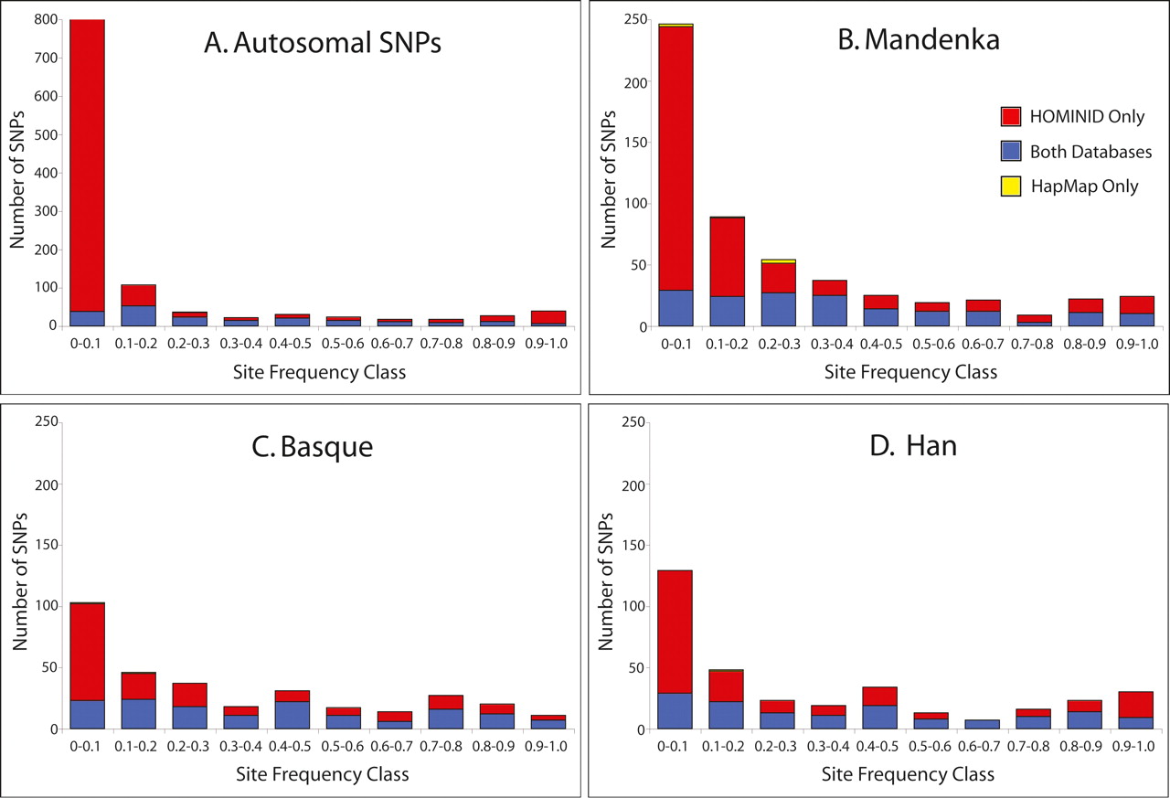Site-frequency spectra of polymorphisms identified at 20 autosomal regions sequenced herein. Current data set is compared with HapMap SNPs (A) globally and for similar populations: (B) Mandenka (Yorubans), (C) French Basque (CEU), and (D) Han Chinese (Han Chinese). SNPs are classed into those found both in the current and HapMap databases (blue), in the current database only (red), or in the HapMap database only (yellow). The number of SNPs identified per population is scaled proportionally; note that Africans contain more SNPs than non-Africans.