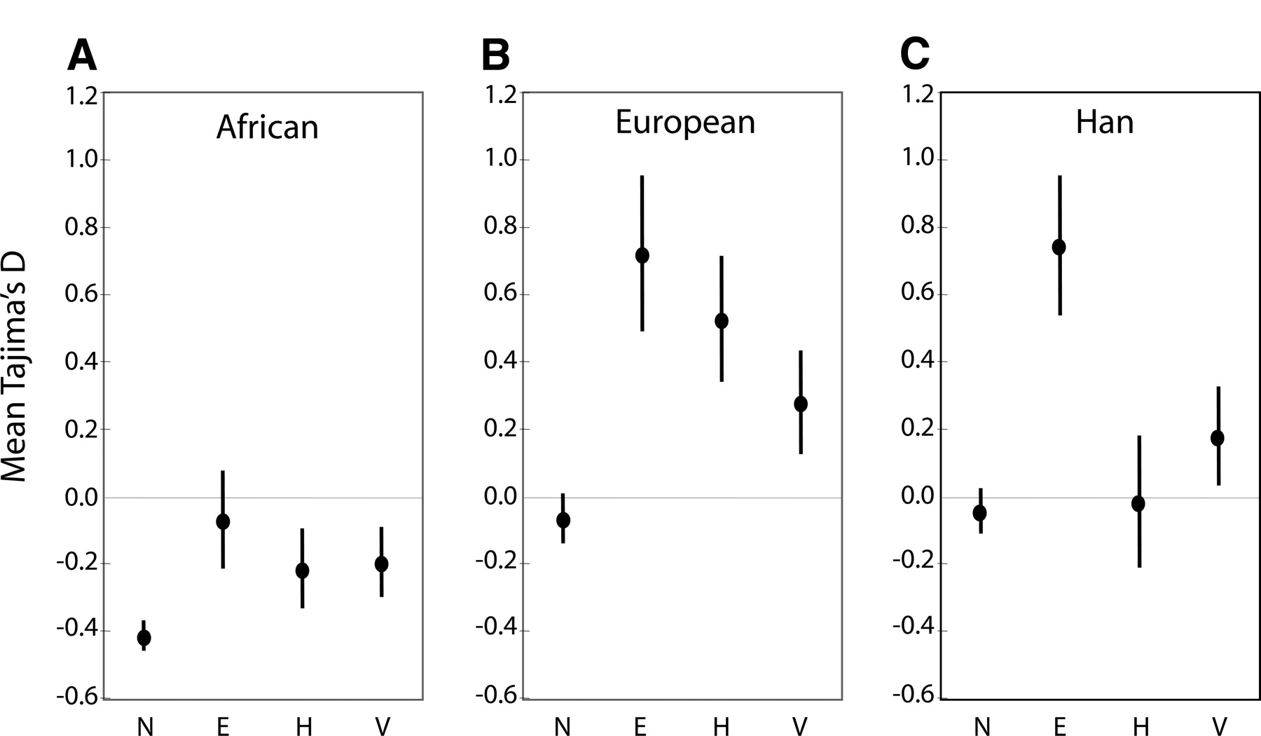 Mean and standard error of Tajima’s D for African, European, and Han samples across different studies; (N) NIEHS; (E) ENCODE; (H) data presented herein; (V) Voight et al. (2005).