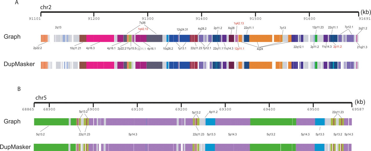 DupMasker defines the substructure of human segmental duplication blocks. Human segmental duplications are organized into complex duplication blocks where individual duplicons originate from different regions of the genome. We assessed the ability of DupMasker to accurately define these ancestral duplicons in this context by comparing results from two regions studied previously in detail (Horvath et al. 2000; Jiang et al. 2007). We schematically display (PARASIGHT: http://eichlerlab.gs.washington.edu/jeff/parasight/index.html) duplicons detected using the A-Bruijn graph approach (top) versus DupMasker (bottom) for (A), an ∼600-kbp region on chromosome 2p11 and (B), an ∼700-kbp region on chromosome 5q13.2. The different duplicons are illustrated as color-coded blocks; different colors correspond to different cytogenetic band locations of the ancestral loci. We found 33/36 nonredundant duplicons blocks are consistent between these two results. The three mismatched blocks are relatively small in length (length <1.5 kb, highlighted in red).