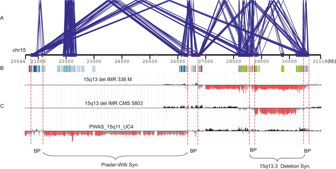 Duplication architecture flanking genomic disorders. This figure shows the duplication architecture defined by DupMasker for one of the most unstable regions of the human genome (15q11–15q13). (A) Blue lines delineate intrachromosomal duplications of high-sequence identity (size ≥10 kb and sequence identity ≥95%) within this region (WGAC) and identify four breakpoint regions associated with Prader-Willi/Angelman Syndrome and the 15q13.3 deletion syndrome. (B) The duplication substructures defined by DupMasker are depicted as color-coded boxes with different colors representing different cytogenetic band locations of duplicons. (C) ArrayCGH data from one patient with Prader-Willi syndrome (bottom) and two patients with chr15q13.3 deletion (Sharp et al. 2008) indicate the patients’ deletion breakpoints overlap with the duplicons defined by DupMasker. The locations of the breakpoint intervals are highlighted by red dashed lines.