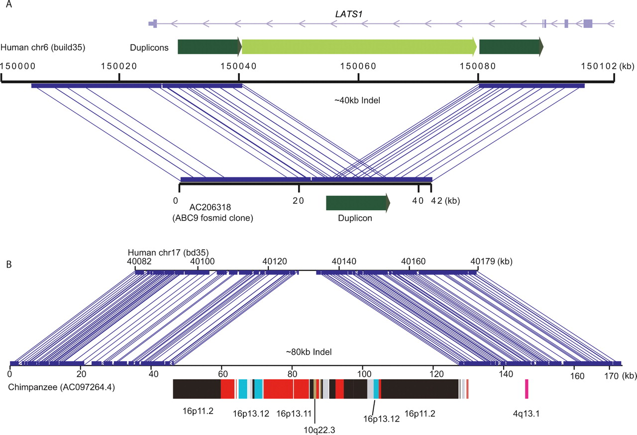 Genomic comparisons by DupMasker. DupMasker facilitates the characterization of duplication-mediated genomic rearrangements. (A) Miropeats (Parsons 1995) comparison between human reference genome (build35, top) against a fosmid clone (bottom) from a Japanese individual (ABC9) identifies a ∼40-kbp deletion. DupMasker on this region identified a pair of tandem duplications (dark green) flanking the internal duplicon (light green), which was likely deleted by NAHR in this Japanese individual. The deletion removes part of the intron of the LATS1 gene. (B) A similar comparison between sequences from a chimpanzee BAC clone (AC097264.4) and its orthologous locus on human chromosome 17 predicts a large (∼80 kbp) chimpanzee-specific insertion. DupMasker analysis suggests that the insertion is the result of a duplicative transposition event composed of segmental duplications that originated from human–chimpanzee ancestral chromosome 16.