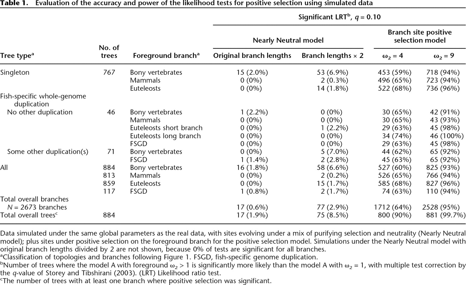 bNumber of trees where the model A with foreground ω2 > 1 is significantly more likely than the model A with ω2 = 1, with multiple test correction by the q-value of Storey and Tibshirani (2003). (LRT) Likelihood ratio test.