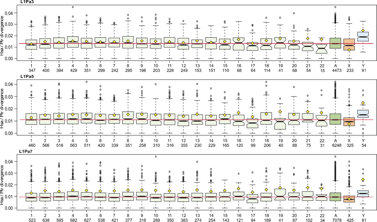 Box blots of the distribution of chromosomal divergence values. The median divergence with a 95% confidence interval (notches) is given for the chimpanzee/human orthologs from the L1Pa3, L1Pa5, and L1Pa7 families. The number below each chromosome is the number of ortholog pairs compared. (A) Combined divergence for all the autosomes, (red line) median value of this divergence, (open circles) indicate outliers. (Box plots for all of the families are shown in Supplemental Fig. S6). (Yellow diamonds) Median value of whole-genome chromosomal divergences between syntenic regions of the chimpanzee and human genomes from Figure 1b in reference The Chimpanzee Sequencing and Analysis Consortium (2005).