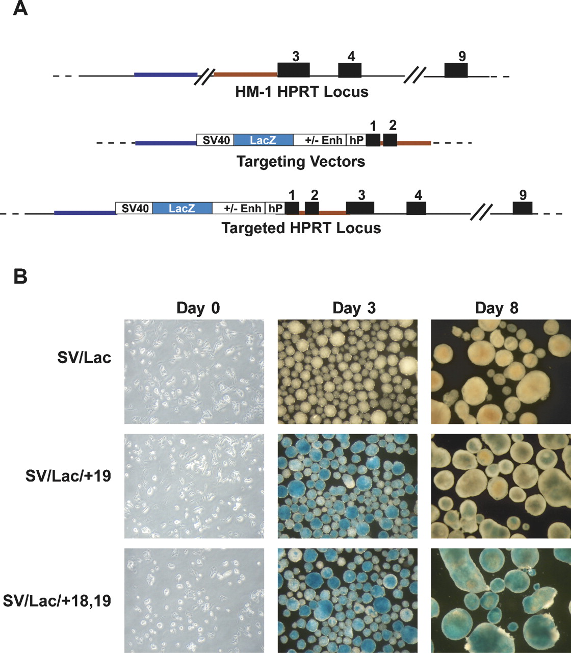 The +18 region can boost the activity of the Tal1 +19 stem cell enhancer. (A) Schematic representation of the Hprt locus in the HM-1 ES cell line, which carries a deletion of exons 1 and 2. SV40 lacZ reporter constructs with or without the 1.1-kb +18/+19 fragment or the +19 element were cloned into an Hprt targeting vector containing the promoter and exon 1 of the human HPRT locus and 2.9 kb of the mouse genomic locus including exon 2. The targeted Hprt locus contains the SV40 lacZ reporter cassettes integrated upstream of the promoter of the fully functional Hprt locus. (B) ES cells expressing either the SVLac control, SVLac/+19, or SVLac/+18,+19 were plated into differentiation assays and analyzed at days 0, 3, and 8 of differentiation. lacZ activity was assessed by staining with X-gal for 2 h.