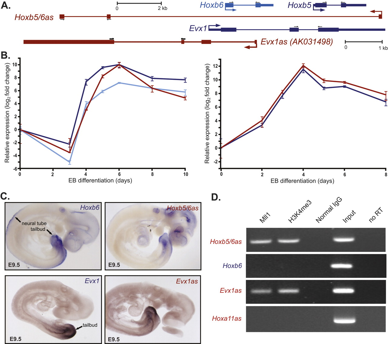 Characterization of ncRNAs associated with Hoxb5/Hoxb6 and Evx1 loci. (A) Genomic context of Hoxb5/Hoxb6 (top) and Evx1 (bottom) and their associated ncRNAs, Hoxb5/6as, and Evx1as. (B) Relative expression profiles of Hoxb5, Hoxb6, and Hoxb5/6as (left) and Evx1 and Evx1as (right) during EB differentiation as determined by qRT-PCR (relative to day 0; primer positions indicated in A). Error bars show standard deviation (SD) determined from three replicates. (C) Whole-mount ISH showing expression of Hoxb6 and Hoxb5/6as (upper panels) and Evx1 and Evx1as (lower panels) in the tail bud of E9.5 mouse embryos. (D) Association of Hoxb5/6as and Evx1as RNAs with H3K4me3 chromatin and MLL1 fractions, as detected by ChIP followed by RT-PCR detection (see Methods). Normal IgG was used as a negative control antibody, and input corresponds to RNA present in the samples before ChIP.