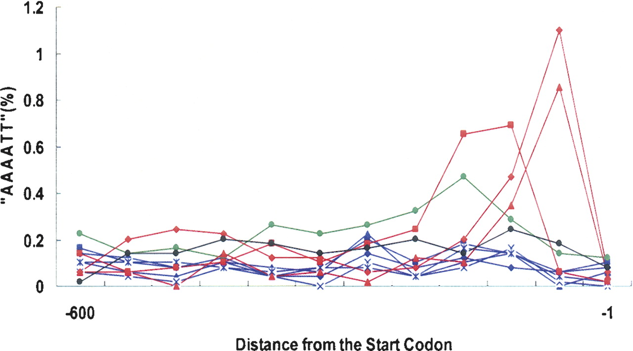 Frequency of the “AAAATT” motif occurrence for the mitochondrial ribosomal protein genes. The X-axis indicates the location of the motif (−1 denotes the first nucleotide upstream of the start codon). (Red) The pre-WGD species (▴, K. waltii; ◆, S. kluyveri; ◼, K. lactis); (blue) the post-WGD species (◆, S. cerevisiae; ◼, S. paradoxus; ▴, S. mikatae; ×, S. bayanus; and *, S. castellii), except for K. polysporus (green ●). (Black ●) Motif occurrence in random sequences that was generated according to the GC content of K. polysporus.