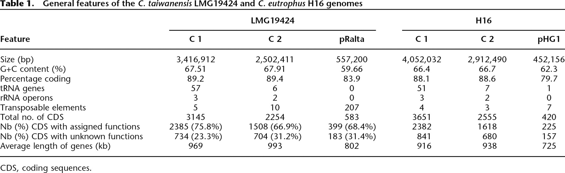 General features of the C. taiwanensis LMG19424 and C. eutrophus H16 genomes