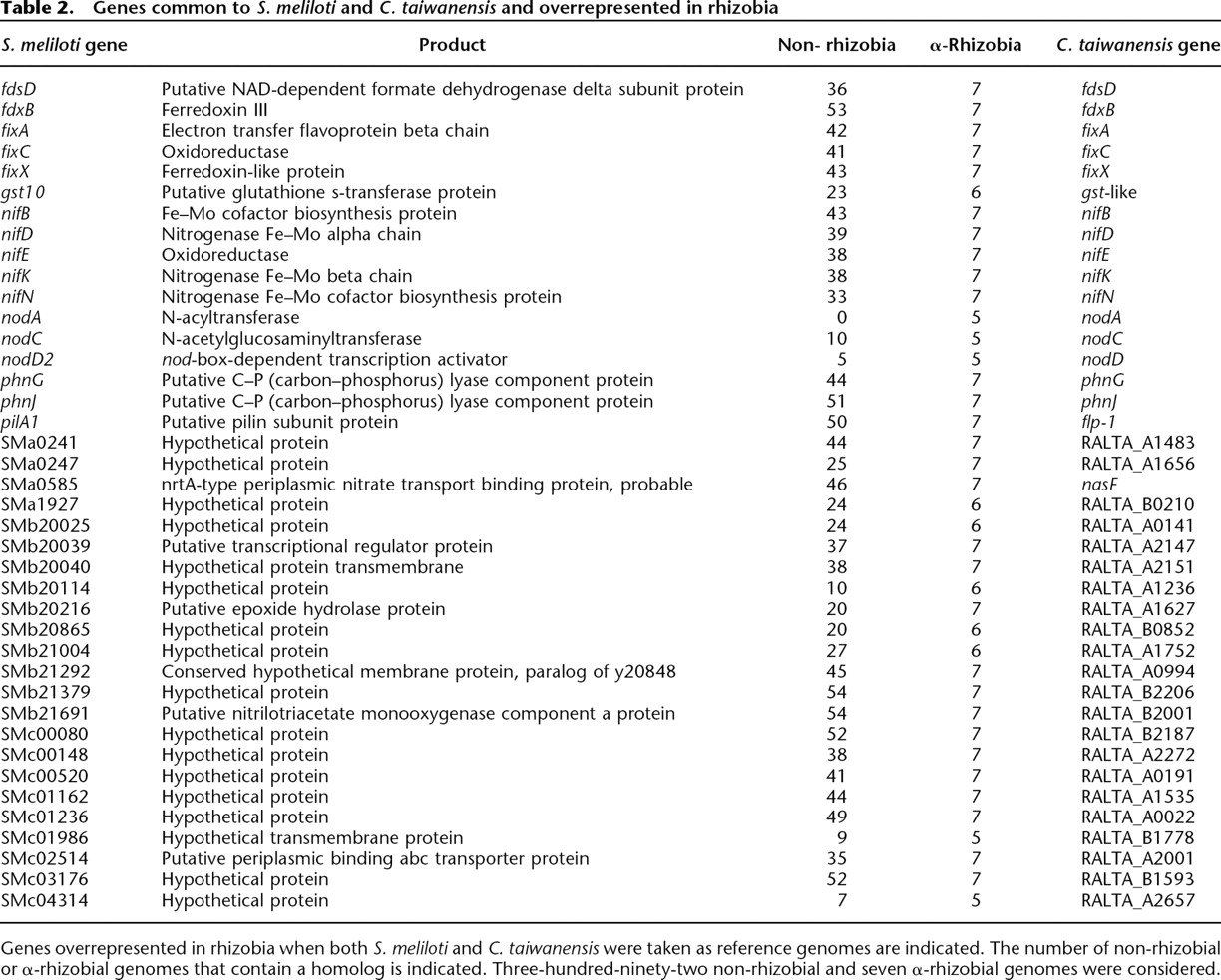 Genes common to S. meliloti and C. taiwanensis and overrepresented in rhizobia