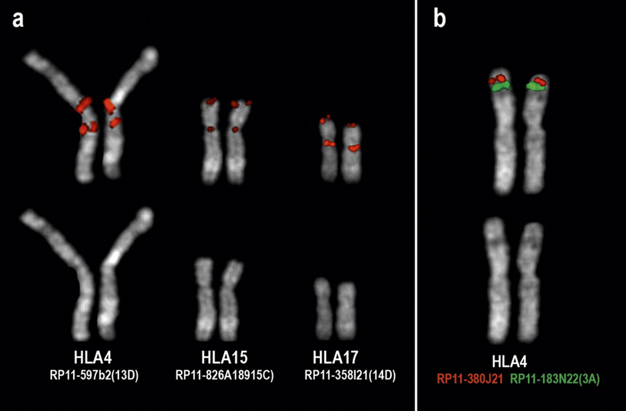 Examples of FISH experiments on Hylobates lar metaphases using human BAC clones as probes. (a) Three examples of inversions, occuring in Hylobatidae ancestor, in which one of the two breakpoints fall in the centromeric/pericentromeric region. The figure shows the signals of the splitting BAC defining the euchromatic breakpoint. The code, in parenthesis on the right of each BAC name, refers to Supplemental Tables ST1 and ST2, where the BAC precise position on the human sequence is also reported. (b) The two BACs RP11-380J21 (red signal) and RP11-183N22 (green signal) are located, in humans, at chr3:64,053,486–64,212,751 and chr3:4,328,222–4,493,696, respectively, suggesting a rearrangement with respect to humans. On the contrary, the rearrangement occurred in the lineage leading to humans.
