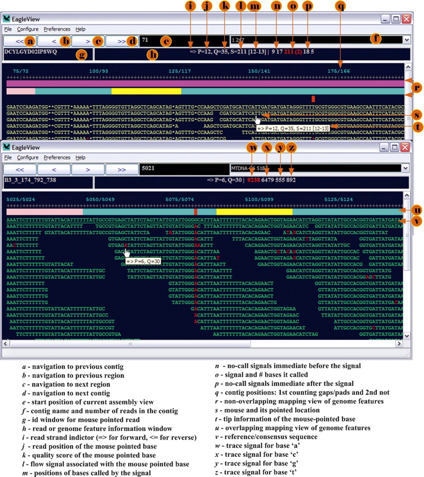Illustration of EagleView features. The EagleView shown in the figure is the version for Microsoft Windows. All features except the mouse-tip window shown in the figure are also available for both Linux and Mac versions. The upper part shows a genome assembly of 454 sequence reads; the lower part displays an assembly of Illumina reads.