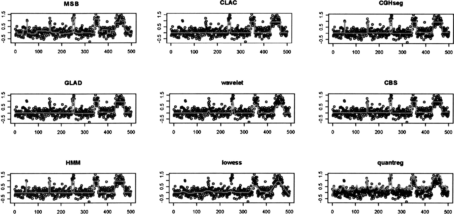 An example of simulated array-CGH data by composed aberrations with increasing width (2, 5, 10, 20, and 40 probes). This signal profile consists of five aberrations of width in increasing order. The amplitude of aberration is 1. Gaussian noise with σ = 0.25 was imposed onto the signal profile in the simulated data. MSB, CGHseg, and HMM clearly detected all five aberrations.