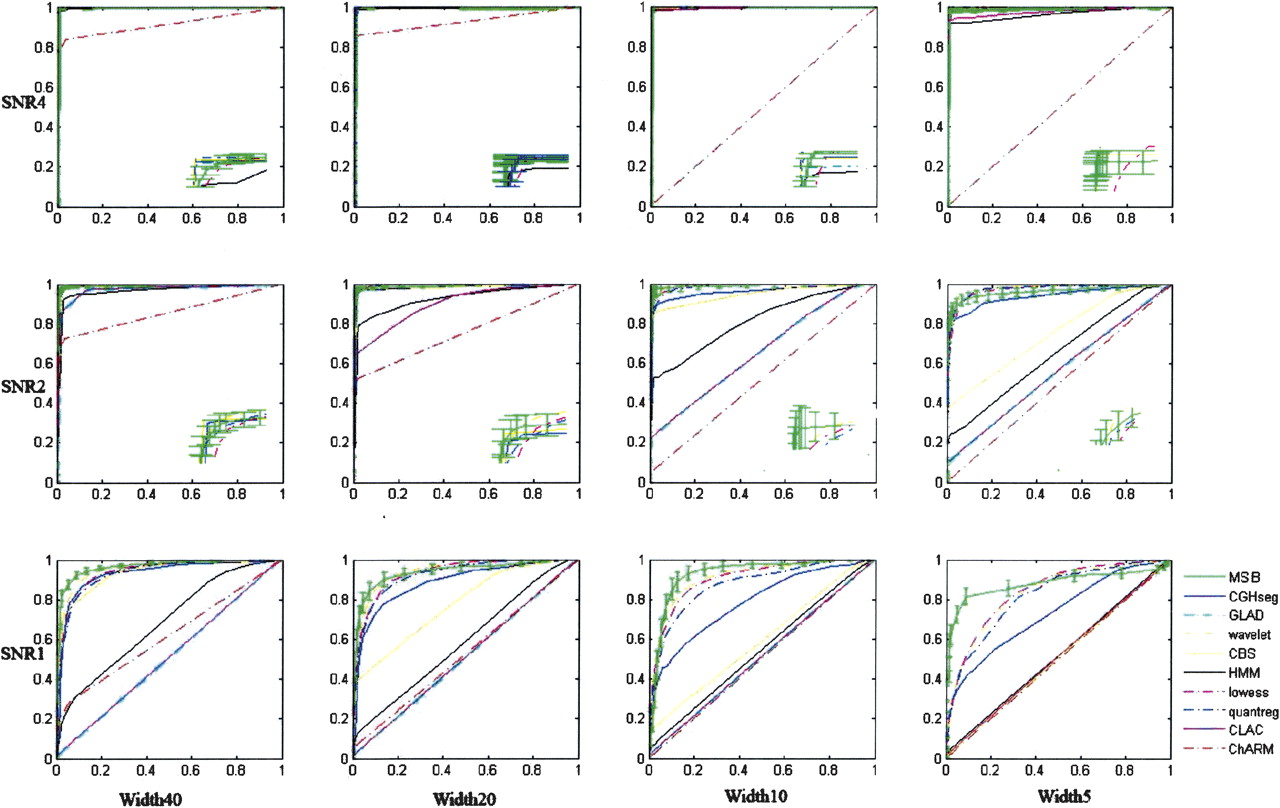 Receiver operating characteristic (ROC) analysis for array-CGH algorithms on simulation data sets. These data sets were simulated at different aberration widths and signal-to-noise ratios (SNRs). Each row represents three different SNR levels (4, 2, and 1, from top to bottom, respectively), and the columns represent aberration widths of 40, 20, 10, and 5 probes from left to right, respectively. The x-axis is 1 − specificity (the false positive rate) and the y-axis is the sensitivity (true positive rate). The curves were generated by measuring the sensitivity and specificity on simulated data at different threshold levels. The green curve refers to MSB. Its 90% confidence intervals are shown by the green bars for different levels. The blue curve is for CGHseg (Picard et al. 2005); the cyan point curve for GLAD (Hupe et al. 2004); the yellow dot curve for wavelet (Hsu et al. 2005); the solid yellow curve is for CBS (Olshen and Venkatraman 2002, 2004; Hsu et al. 2005); the magenta dot curve is for lowess (Beheshti et al. 2003); the blue dot curve is for quantreg (Eilers and de Menezes 2005); the red dot curve is for ChARM (Myers et al. 2004; Lai et al. 2005), the solid black curve is for HMM (Fridlyand et al. 2004); and the solid purple curve is for CLAC (Wang et al. 2005). The bottom right of each figure at SNR level 4 and 2 shows the zoom-in at the low false positive rate region.