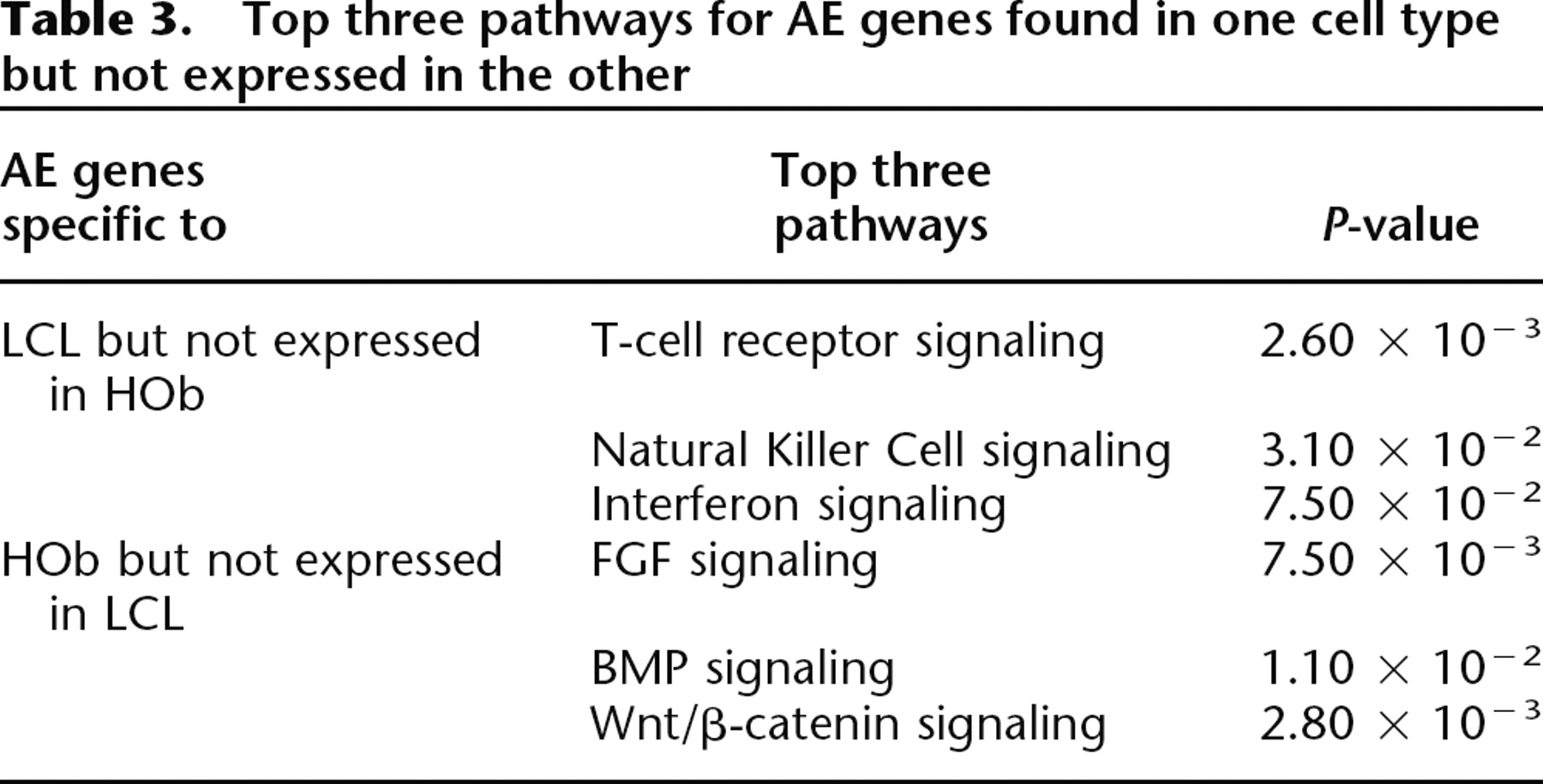 Top three pathways for AE genes found in one cell type but not expressed in the other
