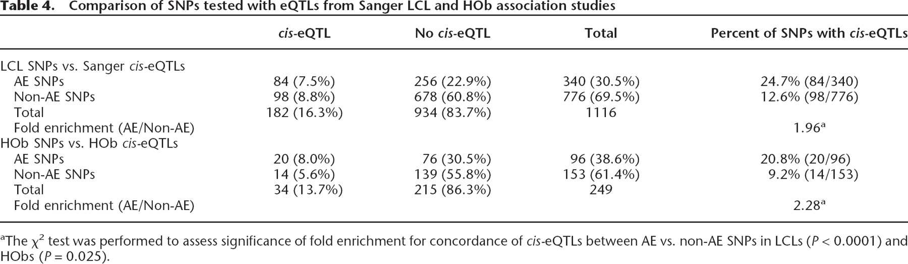 aThe χ2 test was performed to assess significance of fold enrichment for concordance of cis-eQTLs between AE vs. non-AE SNPs in LCLs (P < 0.0001) and HObs (P = 0.025).