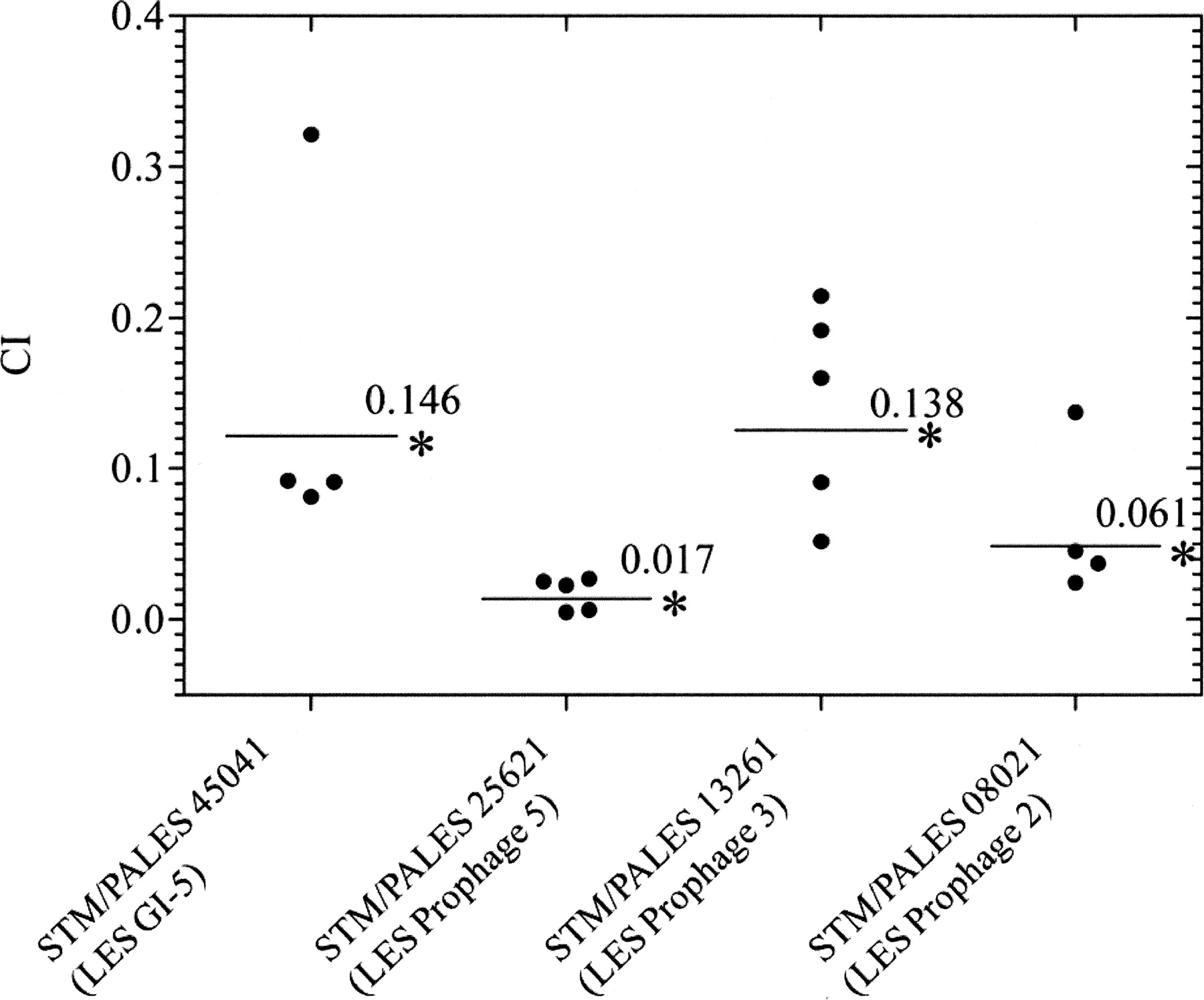In vivo competitive index (CI) of the P. aeruginosa STM PALES_45041 (within LESGI-5), PALES_25621 (within LES prophage 5), PALES_13261 (within LES prophage 3), and PALES_08021 (within LES prophage 2) grown for 7 d in the rat lung in competition with the wild-type LESB58 strain. Each circle represents the CI for a single animal in each group. A CI of less than 1 indicates an attenuation of virulence. The geometric mean of the CIs for all rats is shown as a solid line and statistically significant P-value is indicated with an asterisk (*P < 0.001 using the Mann-Whitney sum test).